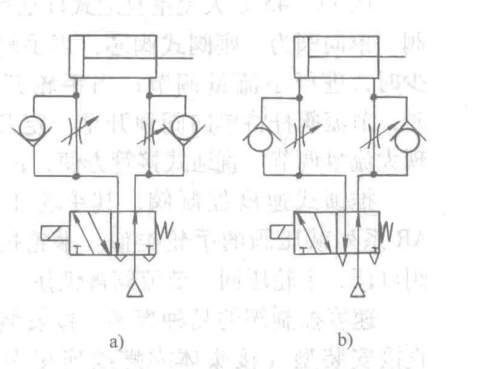 · (b)) (ఇన్లెట్ థ్రోట్లింగ్), ఇన్లెట్-సైడ్ చెక్ వాల్వ్ మూసివేయబడింది మరియు ఎగ్జాస్ట్-సైడ్ చెక్ వాల్వ్ తెరవబడి ఉంటుంది. ఇన్లెట్ వాయుప్రసరణ చిన్నగా ఉంటుంది, కాబట్టి ఇన్లెట్ చాంబర్లో ఒత్తిడి నెమ్మదిగా పెరుగుతుంది, అయితే ఎగ్జాస్ట్ ఛాంబర్ ఒత్తిడి త్వరగా పడిపోతుంది. పిస్టన్ ప్రధానంగా గాలి విస్తరణ ద్వారా కదులుతుంది, వేగ నియంత్రణను అస్థిరంగా చేస్తుంది. ఈ పద్ధతి సాధారణంగా సింగిల్-యాక్టింగ్ సిలిండర్లు, బిగింపు సిలిండర్లు లేదా తక్కువ-ఘర్షణ సిలిండర్ల కోసం మాత్రమే ఉపయోగించబడుతుంది.