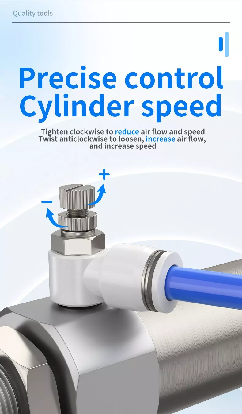 స్పీడ్ కంట్రోలర్లు యాక్యుయేటర్ల పొడిగింపు మరియు ఉపసంహరణ వేగాన్ని సర్దుబాటు చేయడానికి ఉపయోగించే సాధారణ వాయు భాగాలు. థొరెటల్ వాల్వ్లు తప్పనిసరిగా సిలిండర్ వేగాన్ని నియంత్రించే ఫ్లో-సర్దుబాటు భాగాలు, కానీ వాటి ఇన్స్టాలేషన్ స్థానాలు, థ్రోట్లింగ్ దిశలు మరియు శరీర నమూనాలు విభిన్నంగా ఉంటాయి. నియంత్రణ పద్ధతి ప్రకారం, వాటిని ఎగ్జాస్ట్-థ్రోట్లింగ్ రకం మరియు ఇన్లెట్-థ్రోట్లింగ్ రకంగా విభజించవచ్చు.