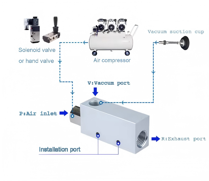 వాక్యూమ్ జనరేటర్ అనేది కొత్త రకం సమర్థవంతమైన, శుభ్రమైన, ఆర్థిక మరియు చిన్న వాక్యూమ్ భాగం, ఇది ప్రతికూల పీడనాన్ని ఉత్పత్తి చేయడానికి సానుకూల పీడన వాయు మూలాన్ని ఉపయోగిస్తుంది. ఇది సంపీడన వాయువు ఉన్న ప్రదేశాలలో లేదా వాయు వ్యవస్థలో సానుకూల మరియు ప్రతికూల ఒత్తిళ్లు అవసరమయ్యే ప్రదేశాలలో ప్రతికూల ఒత్తిడిని పొందడం చాలా సులభం మరియు సౌకర్యవంతంగా ఉంటుంది.