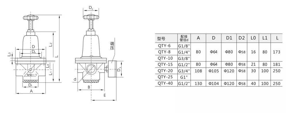 QTY: స్టాండర్డ్ ప్రెజర్ రెగ్యులేటర్, సాధారణ పీడన శ్రేణికి అనుకూలం (మధ్యస్థం నుండి తక్కువ పీడన పారిశ్రామిక అనువర్తనాలు).