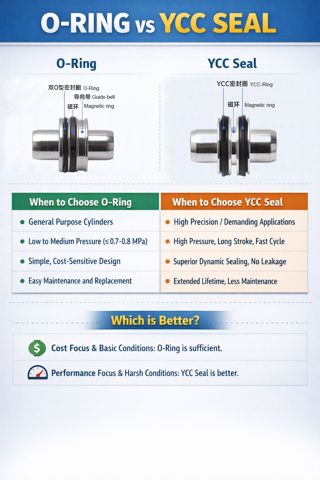 సాంప్రదాయ O-రింగ్లతో పోల్చితే, YCC సీల్ మెరుగైన డైనమిక్ సీలింగ్ మరియు వేర్ రెసిస్టెన్స్ని అందిస్తుంది, సిలిండర్ ఒత్తిడి మార్పులు మరియు పునరావృత సైకిల్స్లో నమ్మకమైన పనితీరును నిర్వహించడానికి అనుమతిస్తుంది. ఇది ప్రారంభ లీకేజీని గణనీయంగా తగ్గిస్తుంది మరియు నిర్వహణ విరామాలను పొడిగిస్తుంది.