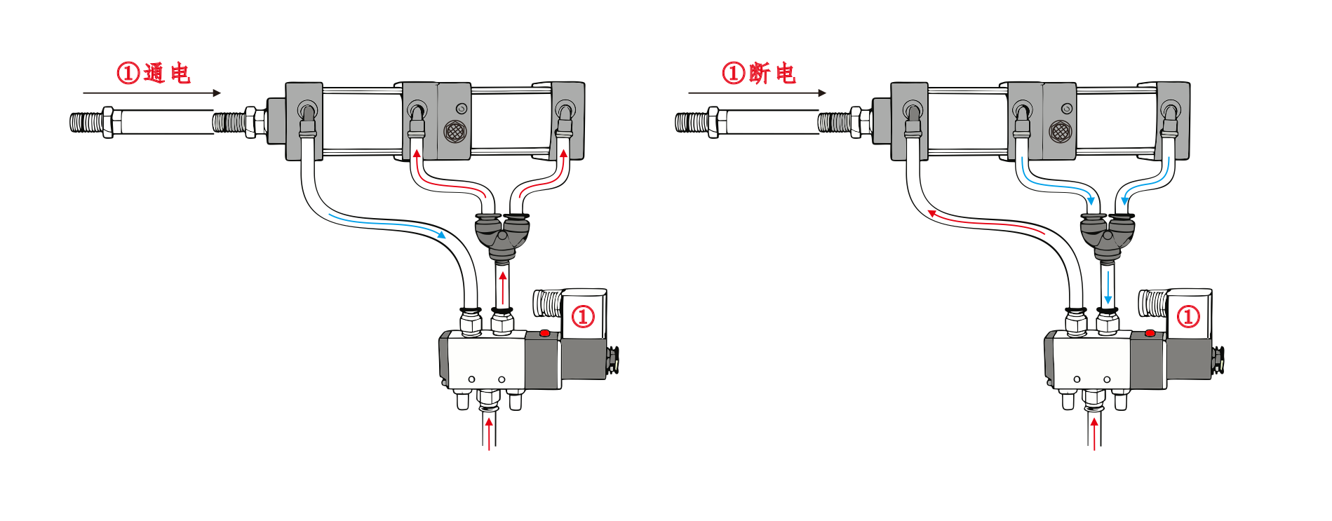 సిలిండర్ యొక్క ఎయిర్ ఇన్లెట్ సోలనోయిడ్ వాల్వ్ యొక్క పోర్ట్ Aకి కనెక్ట్ చేయబడింది మరియు సిలిండర్ యొక్క ఎయిర్ ఇన్లెట్ సోలనోయిడ్ వాల్వ్ యొక్క పోర్ట్ Bకి సిరీస్లో కనెక్ట్ చేయబడింది. సిలిండర్ యొక్క ఎయిర్ ఇన్లెట్ సైలెన్సర్కి కనెక్ట్ చేయబడింది. సోలనోయిడ్ వాల్వ్ యొక్క పోర్ట్ A శక్తివంతం అయినప్పుడు, సిలిండర్లు ఉపసంహరించబడిన స్థితిలో ఉంటాయి. పోర్ట్ B శక్తివంతం అయినప్పుడు, సిలిండర్లు పనిచేయడం ప్రారంభిస్తాయి.