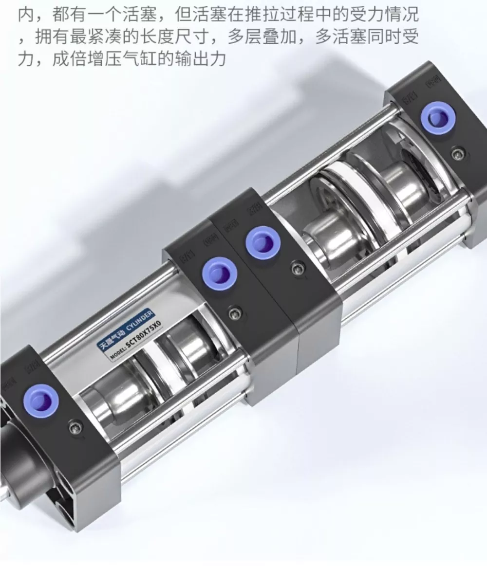 SCT టై-రాడ్ సిలిండర్ ద్వి-దిశాత్మక YCC సీలింగ్ రింగ్లను మరియు శక్తివంతమైన డబుల్-స్ట్రోక్ డిజైన్ను కలిగి ఉంది, ఇది కాంపాక్ట్ మరియు శుద్ధి చేసిన ప్రదర్శనతో వేగవంతమైన చర్య మరియు మృదువైన, స్థిరమైన అవుట్పుట్ను నిర్ధారిస్తుంది. సిలిండర్ యొక్క ప్రతి పొర ఒక వ్యక్తిగత పిస్టన్ను కలిగి ఉంటుంది మరియు పుష్-పుల్ ప్రక్రియలో బహుళ పిస్టన్లు లోడ్ను పంచుకుంటాయి, సిలిండర్ దాని బహుళ-పొర పేర్చబడిన నిర్మాణం ద్వారా గుణించిన అవుట్పుట్ శక్తిని ఉత్పత్తి చేసేటప్పుడు అత్యంత కాంపాక్ట్ పొడవును సాధించడానికి అనుమతిస్తుంది. ఈ డబుల్-ఫోర్స్ డిజైన్ బలమైన శక్తిని అందిస్తుంది మరియు సిక్స్-సీల్-రింగ్ కాన్ఫిగరేషన్ అద్భుతమైన సీలింగ్ పనితీరును అందిస్తుంది, సిలిండర్ లీకేజీ లేకుండా 1.4 MPa వరకు ఒత్తిడిని కలిగి ఉండేలా చేస్తుంది.