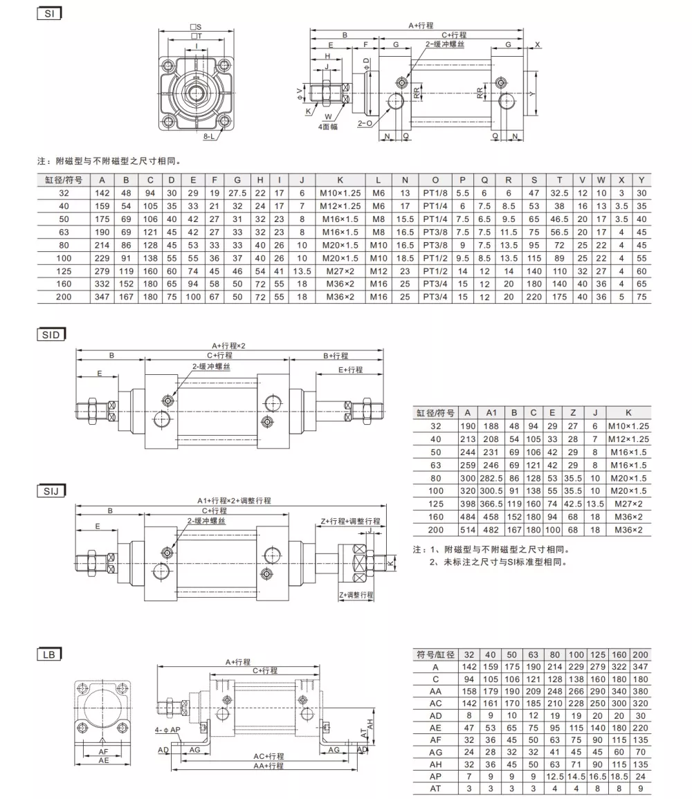 SI సిరీస్ ISO15552 ప్రామాణిక వాయు సిలిండర్ మూడు రకాలుగా అందుబాటులో ఉంది: ప్రామాణిక డబుల్-యాక్టింగ్, SID డబుల్-రాడ్ డబుల్-యాక్టింగ్ మరియు సర్దుబాటు స్ట్రోక్తో SIJ డబుల్-రాడ్ డబుల్-యాక్టింగ్. అవి ISO 15552 ప్రమాణానికి అనుగుణంగా ఉంటాయి, అంటే వాటి ఇన్స్టాలేషన్ కొలతలు కంటే పెద్దవిSU వాయు సిలిండర్లుఅదే పరిమాణంలో. స్థిర ఉపకరణాలు పరస్పరం మార్చుకోలేవు మరియు ISO 15552 (గతంలో ISO 6431) స్పెసిఫికేషన్లకు మాత్రమే అనుకూలంగా ఉంటాయి.