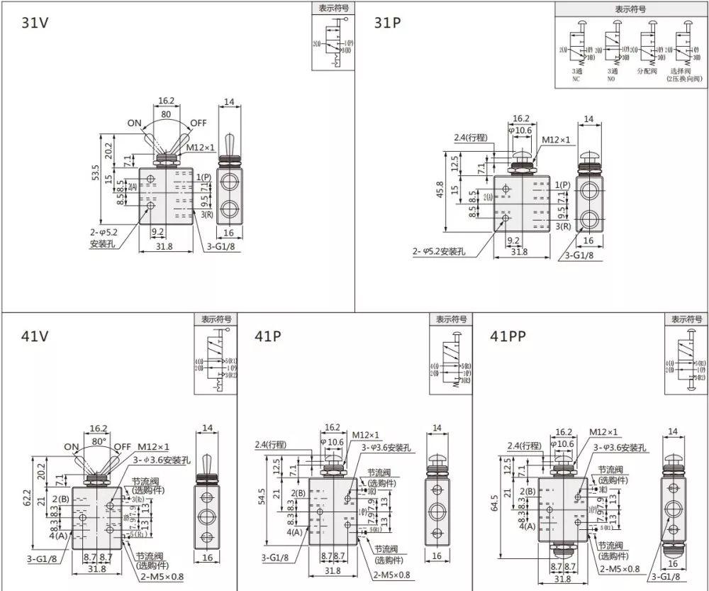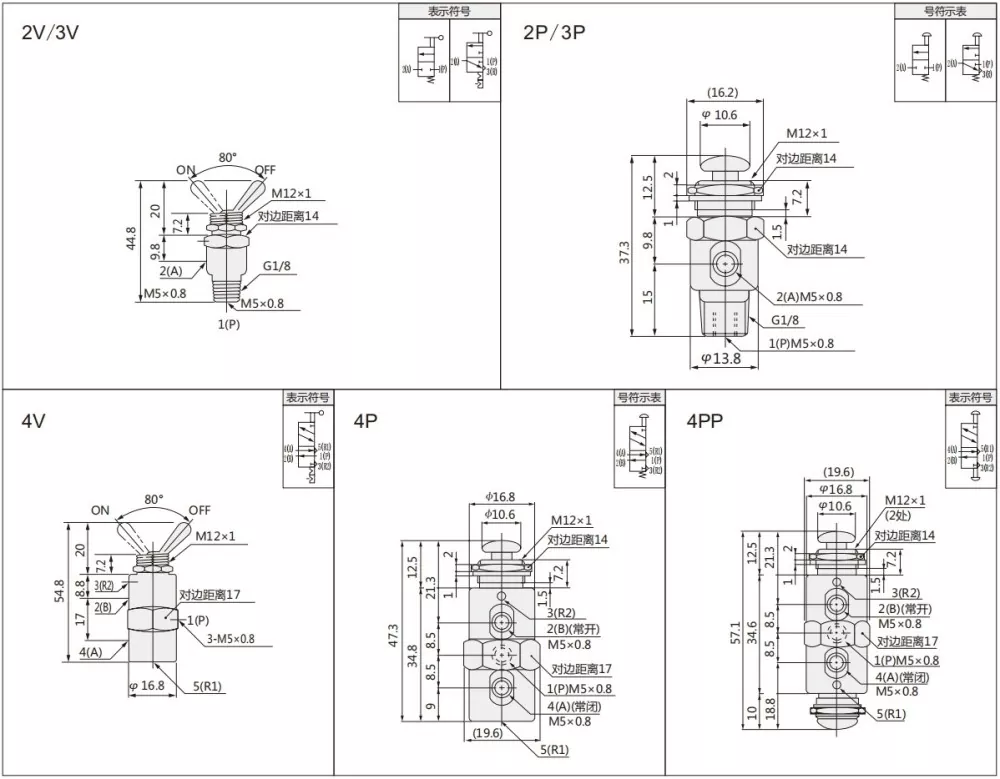 TAC సిరీస్ టోగుల్ వాల్వ్ 2 స్థానం 2 మార్గం, 2 స్థానం 3 వే మరియు 2 స్థానం 5 మార్గాన్ని ఎంచుకోవచ్చు. వివిధ లివర్ రకం మరియు రెండు రకాల థ్రెడ్: M5, G1/8.