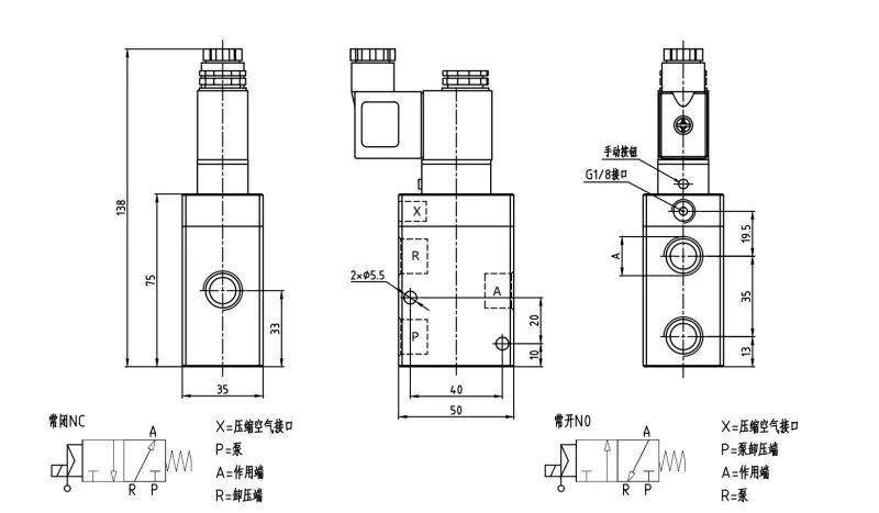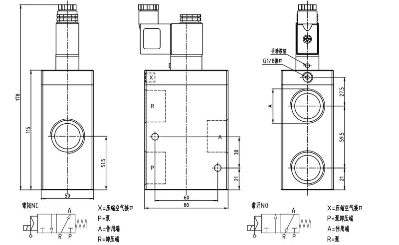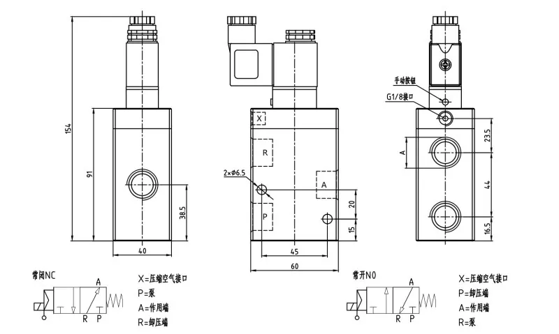 థ్రెడ్ పోర్ట్ (P, A, R) పరిమాణాలు G3/8, G1/2, మరియు G1 లలో లభిస్తాయి, G1/8 లో సంపీడన ఎయిర్ పోర్ట్ (X) తో.